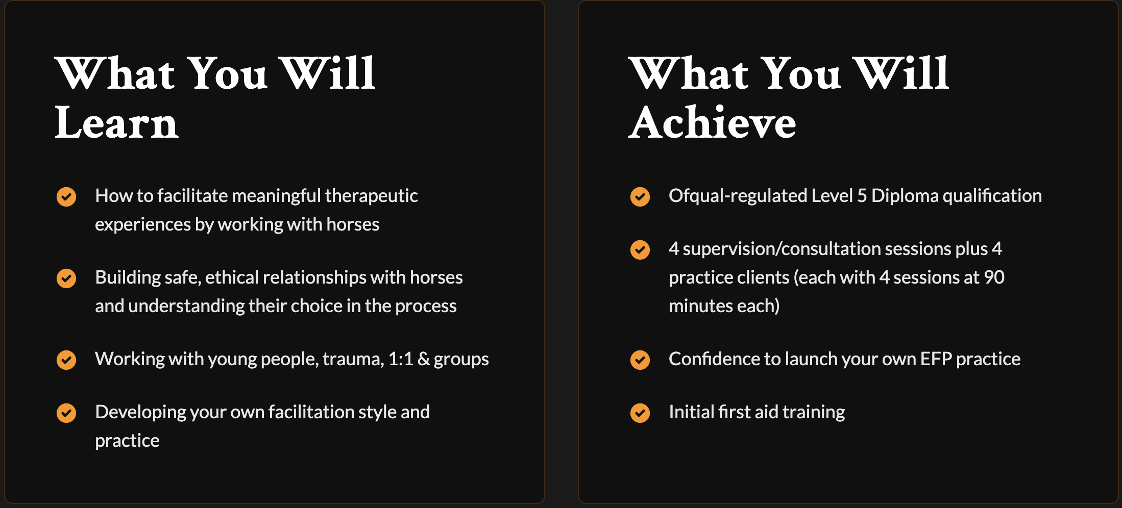 The Level 5 Diploma in Equine Facilitated Psychotherapy prepares advanced practitioners to work with individuals and complex cases using trauma-informed, evidence-based equine-assisted interventions. The course has 6 modules taught online and in person over a 6-month period of independent study, assignments, case study analysis, clinical presentations, supervised practice, advanced mentoring and independent learning between the blocks. The programme is designed for experienced mental health professionals who intend to specialise in EFP (equine-facilitated psychotherapy) as a clinical practice.